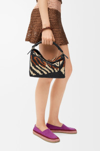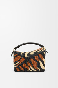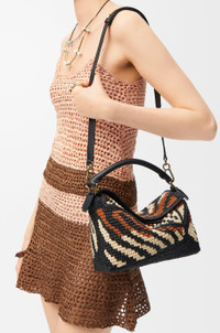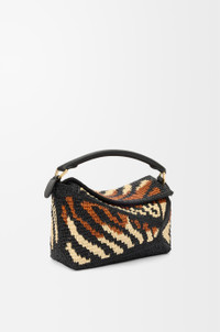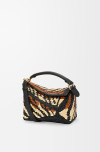 The Puzzle Edge is defined by its distinctive geometric lines and its cuboid form. It differs to the classic construction in its overlapped panels with single stitch lines. This small version is crafted in raffia and calfskin and features tiger stripes. - Shoulder, crossbody or hand carry - Detachable and adjustable strap, top handle - Zip closure with calfskin pull - One internal slip pocket - Herringbone cotton canvas lining Colour: Black/Honey Gold Metallic colour: Gold Main material: Raffia/Calf Strap length: 80.5 - 115.5 cm Strap drop: 40 - 58 cm Handle drop: 7 cm Weight: 0.55 kg Height: 16.5 cm Width: 24 cm Depth: 10.5 cm Made in: Spain