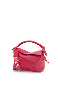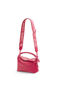 The Puzzle bag is the debut bag for LOEWE by Creative Director Jonathan Anderson. A cuboid shape and precise cutting technique create Puzzle’s distinctive geometric lines. This monochrome version is crafted in satin calfskin with tonal shiny hardware, a tonal jacquard strap and a tonal bunny charm in porcelain. This bag is part of a limited edition collection inspired by the monochrome glazes of ancient Chinese ceramics. - The Small Puzzle can hold for example a large wallet, a mobile phone and a sunglasses case - Shoulder, crossbody or hand carry - Detachable and adjustable shoulder strap - One internal slip pocket - Customisable with strap and personalisation charms - Tonal herringbone cotton canvas lining - Embossed Anagram Details - Colour: Ruby Red Glaze - Metallic colour: Gold - Main material: Satin Calf - Strap length: 80 - 135 cm - Weight: 0.58 kg - Height (cm): 16.5 - Width (cm): 24 - Depth (cm): 10.5 - Height (inch): 6.5 - Width (inch): 9.4 - Depth (inch): 4.1 - Model ID: A510P60X24 - CIL: 0010799567 - Made in: Spain