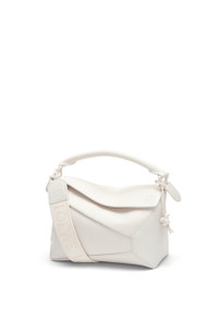 The Puzzle bag is the debut bag for LOEWE by Creative Director Jonathan Anderson. A cuboid shape and precise cutting technique create Puzzle’s distinctive geometric lines. This monochrome version is crafted in satin calfskin with tonal shiny hardware, a tonal jacquard strap and a tonal bunny charm in porcelain. This bag is part of a limited edition collection inspired by the monochrome glazes of ancient Chinese ceramics. - The Small Puzzle can hold for example a large wallet, a mobile phone and a sunglasses case - Shoulder, crossbody or hand carry - Detachable and adjustable shoulder strap - One internal slip pocket - Customisable with strap and personalisation charms - Tonal herringbone cotton canvas lining - Embossed Anagram Details - Colour: White Glaze - Metallic colour: Gold - Main material: Satin Calf - Strap length: 80 - 135 cm - Weight: 0.58 kg - Height (cm): 16.5 - Width (cm): 24 - Depth (cm): 10.5 - Height (inch): 6.5 - Width (inch): 9.4 - Depth (inch): 4.1 - Model ID: A510P60X24 - CIL: 0010808954 - Made in: Spain