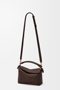 The Puzzle Edge is defined by its distinctive geometric lines and its cuboid form. It differs to the classic construction in its overlapped panels with single stitch lines. This small version is crafted in soft grained calfskin. - Shoulder, crossbody or hand carry - Detachable and adjustable strap - Zip closure with calfskin pull - One external zip rear pocket, one internal slip pocket - Herringbone cotton canvas lining - Embossed Anagram Colour: Dark Chestnut Metallic colour: Gold Main material: Soft Grained Calf Strap length: 80.5 - 115.5 cm Strap drop: 40 - 58 cm Handle drop: 7 cm Weight: 0.57 kg Height: 16.5 cm Width: 24 cm Depth: 10.5 cm Made in: Spain