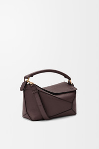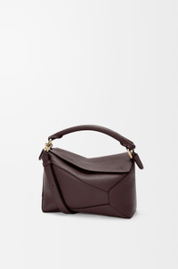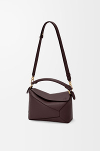 The Puzzle Edge is defined by its distinctive geometric lines and its cuboid form. It differs to the classic construction in its overlapped panels with single stitch lines. This small version is crafted in soft grained calfskin. - Shoulder, crossbody or hand carry - Detachable and adjustable strap - Zip closure with calfskin pull - One external zip rear pocket, one internal slip pocket - Herringbone cotton canvas lining - Embossed Anagram Colour: Dark Chestnut Metallic colour: Gold Main material: Soft Grained Calf Strap length: 80.5 - 115.5 cm Strap drop: 40 - 58 cm Handle drop: 7 cm Weight: 0.57 kg Height: 16.5 cm Width: 24 cm Depth: 10.5 cm Made in: Spain