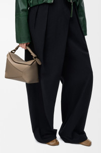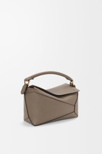 The Puzzle Edge is defined by its distinctive geometric lines and its cuboid form. It differs to the classic construction in its overlapped panels with single stitch lines. This small version is crafted in soft grained calfskin. - Shoulder, crossbody or hand carry - Detachable and adjustable strap - Zip closure with calfskin pull - One external zip rear pocket, one internal slip pocket - Herringbone cotton canvas lining - Embossed Anagram Colour: Taupe Metallic colour: Gold Main material: Soft Grained Calf Strap length: 80.5 - 115.5 cm Strap drop: 40 - 58 cm Handle drop: 7 cm Weight: 0.57 kg Height: 16.15 cm Width: 24 cm Depth: 10.5 cm Made in: Spain