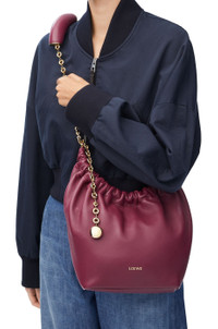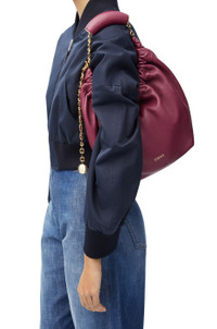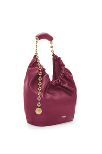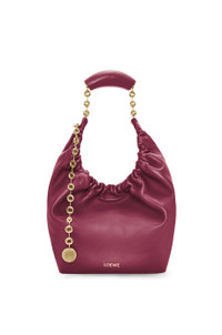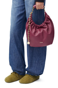 The Squeeze is an innovative expression of traditional craftsmanship. Its light ruched body is complemented by signature details such as an adjustable donut chain and a tactile squeezy handle. This small version is crafted in nappa lambskin. - Shoulder, crossbody or hand carry - Adjustable chain strap with Anagram Pebble and additional chain to extend the strap further - Magnetic closure - Internal zipped pocket - Unlined - Gold or silver embossed LOEWE Details - Colour : Crimson - Metallic colour : Gold - Main material : Mellow Nappa Lambskin - Strap length : 20 cm - Strap drop : 28 - 54 cm - Handle drop : 48 - 100 cm - Weight : 0.5 kg - Height (cm) : 24 - Width (cm) : 29 - Depth (cm) : 10.5 - Height (inch) : 9.4 - Width (inch) : 11.4 - Depth (inch) : 4.1 - Model ID : A914NCHX01 - CIL : - 0011092558 - Made in : Spain