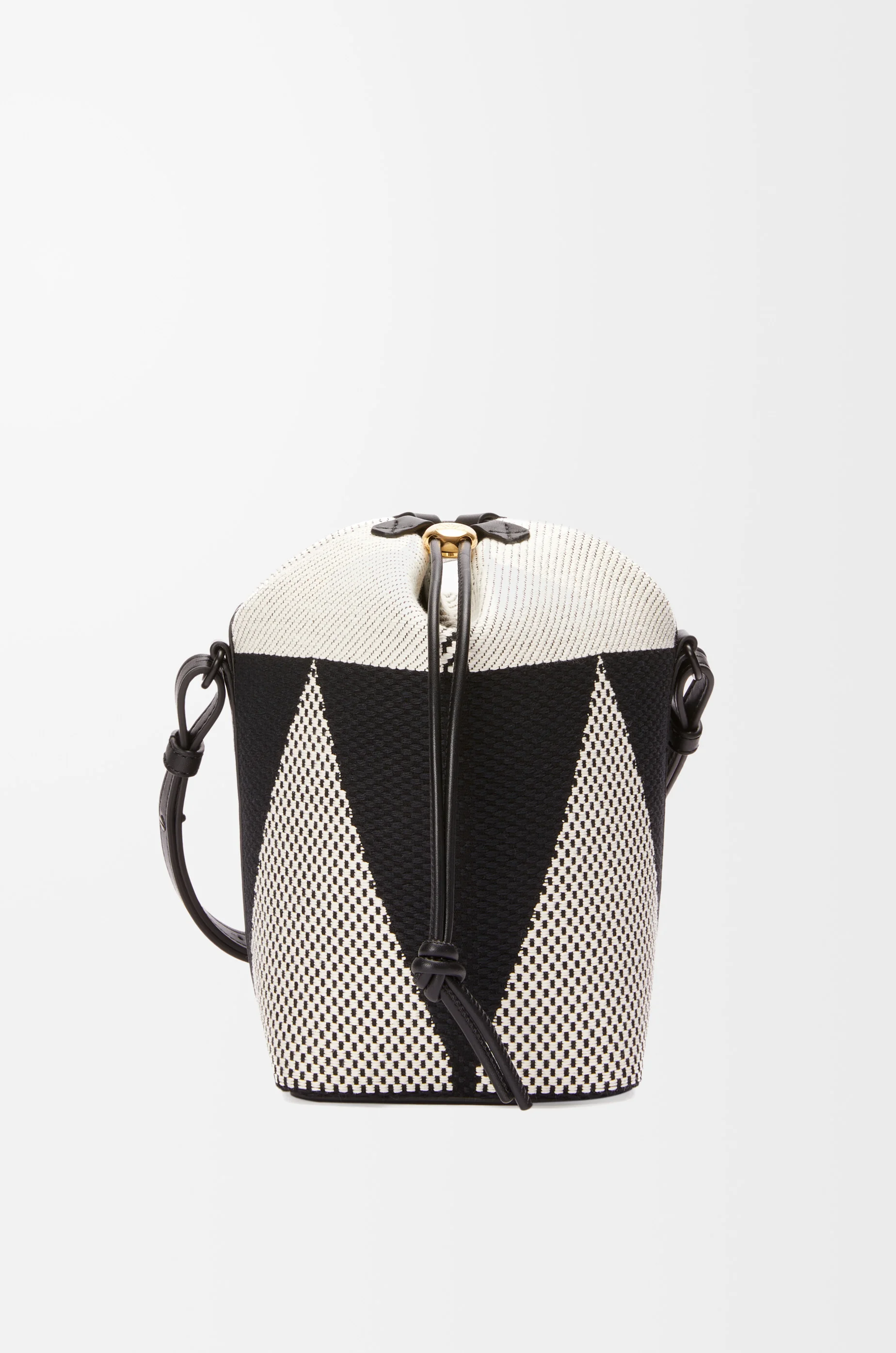 This special edition bucket created in collaboration with US-based artist Kay Sekimachi showcases her pioneering work in loom weaving, inspired by her 1999 linen series Takarabako. This small version is crafted in cotton jacquard with calfskin base and details. - Detachable and adjustable calfskin strap - Calfskin drawstring closure with Anagram Pebble fastening - Textile lining - Gold embossed Kay Sekimachi LOEWE - Embossed Anagram Details - Colour : Natural/Black - Metallic colour : Gold - Main material : Textile - Strap length : 117 - 131 cm - Strap drop : 57 - 66 cm - Weight : 0.286 kg - Height (cm) : 23 - Width (cm) : 12 - Depth (cm) : 12 - Height (inch) : 9.1 - Width (inch) : 4.7 - Depth (inch) : 4.7 - Model ID : A754300X01 - CIL : - 0011124815 - Made in : Spain