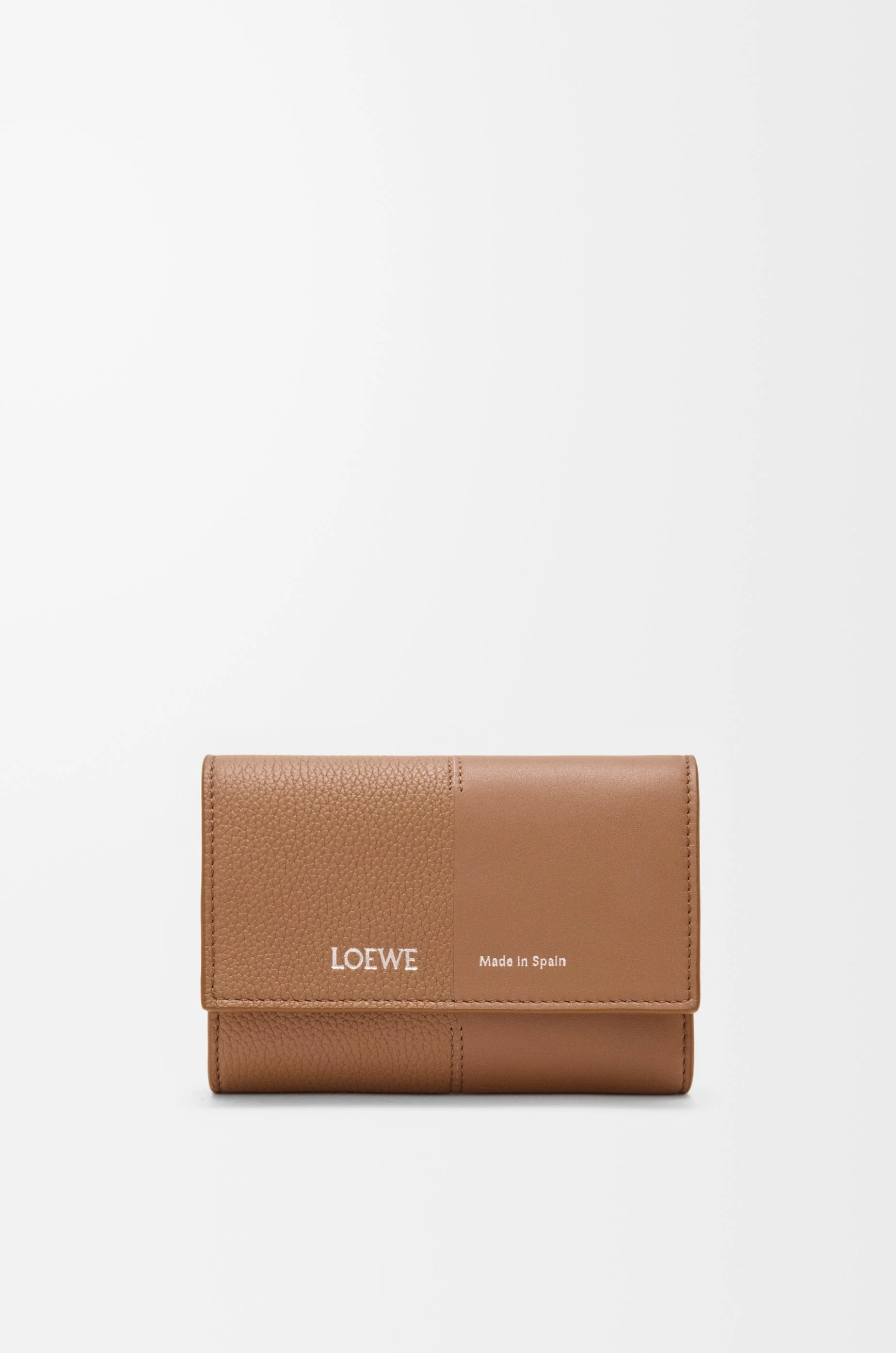 Small vertical wallet in smooth and grained calfskin crafted using the leather marquetry technique. - Six card slots, two small pockets, one larger pocket - One zipped coin compartment - Snap button closure - Calfskin lining - Gold or silver embossed LOEWE Made in Spain Colour: Mocha Metallic colour: Palladium Main material: Smooth/grained calf Weight: 0.096 kg Height: 8.2 cm Width: 11.8 cm Depth: 3 cm Made in: Spain