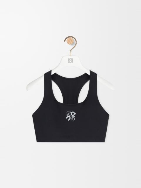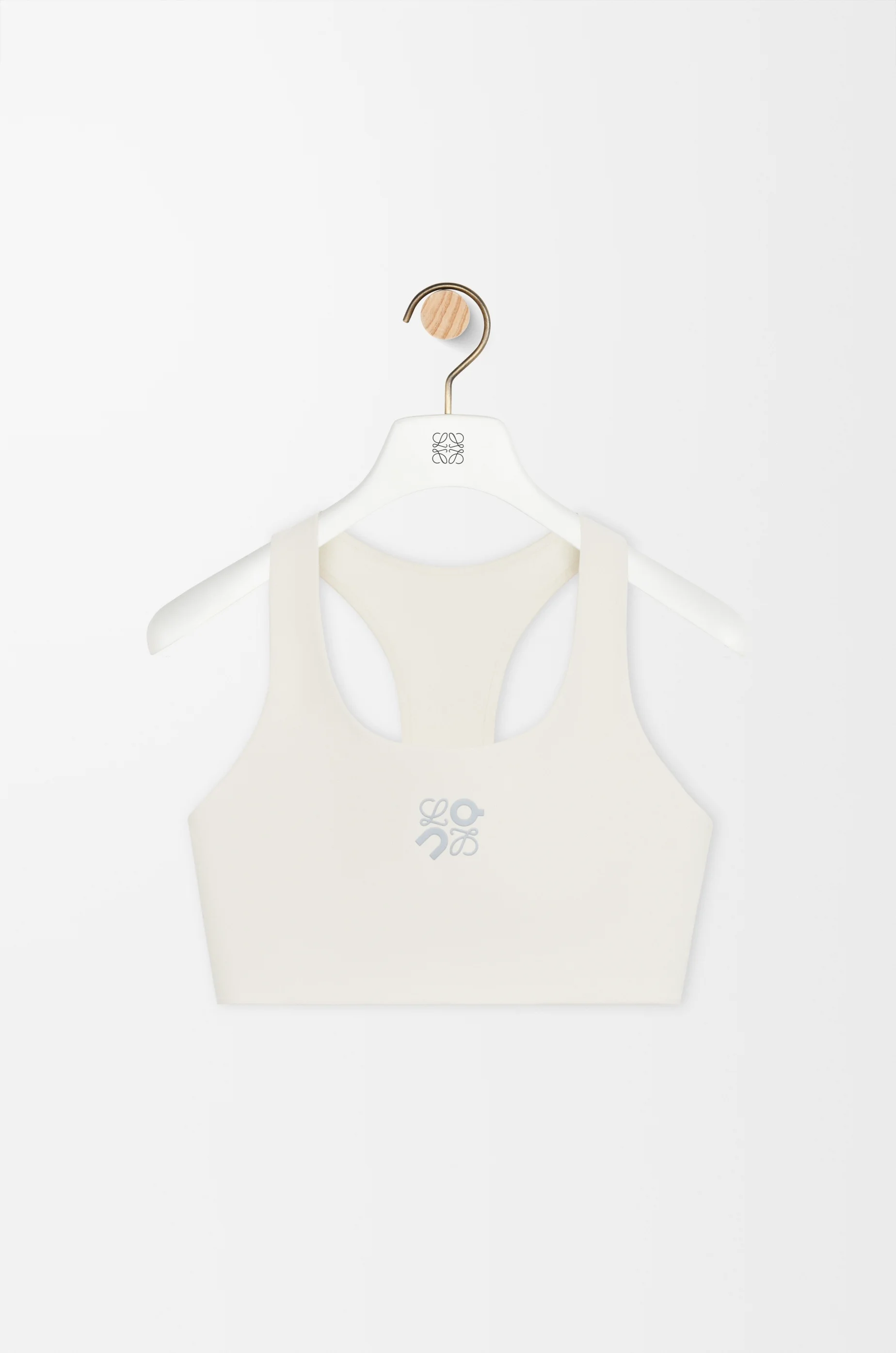 Bra in lightweight sculping stretch 3D technical jersey featuring a scoop neck with a racerback and a spacer and underband for coverage and support. - Slim fit, cropped length - Elasticated hem - Bonded seams and flatlock stitching - Reflective Anagram placed at the front - Reflective LOEWE ON logo placed at the back Colour: Ivory Main material: Polyester/Elastane Weight: 0.1 kg Materials & care Main Material: 72% polyester 28% elastane