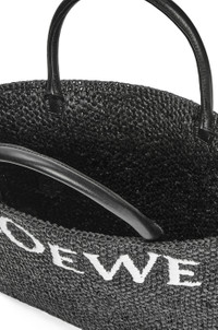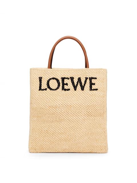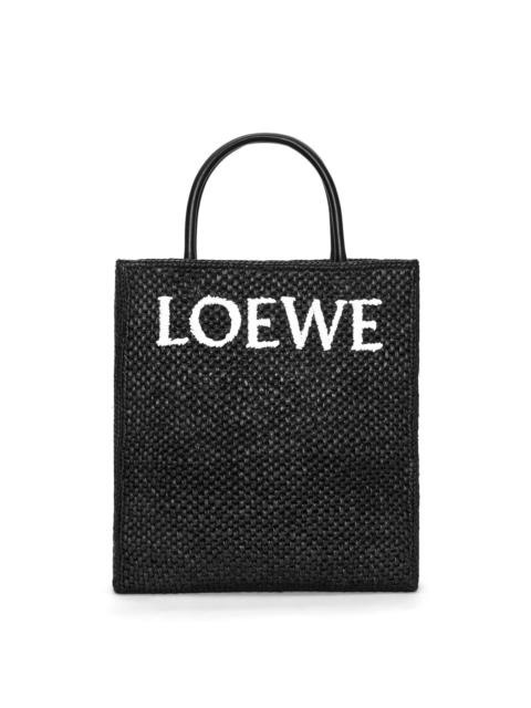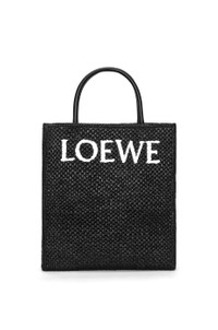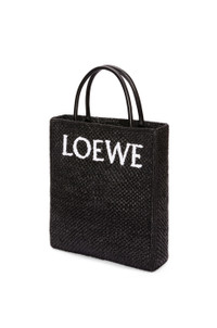Simple and striking, the Standard Tote has a clean silhouette, pragmatic shape and top handles. This A4 version is crafted in raffia with calfskin top handles and a contrasting LOEWE signature. - Hand or shoulder carry - Detachable and adjustable shoulder strap Details - Colour: Black/White - Metallic colour: Gold - Main material: Raffia - Strap length: 87 - 98 cm - Handle drop: 11.5 cm - Weight: 0.59 kg - Height (cm): 36 - Width (cm): 28 - Depth (cm): 7.5 - Height (inch): 14.2 - Width (inch): 11 - Depth (inch): 3 - Model ID: A563R18X04 - CIL: 0010852663 - Made in: Spain