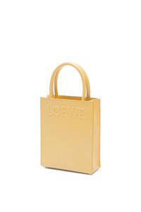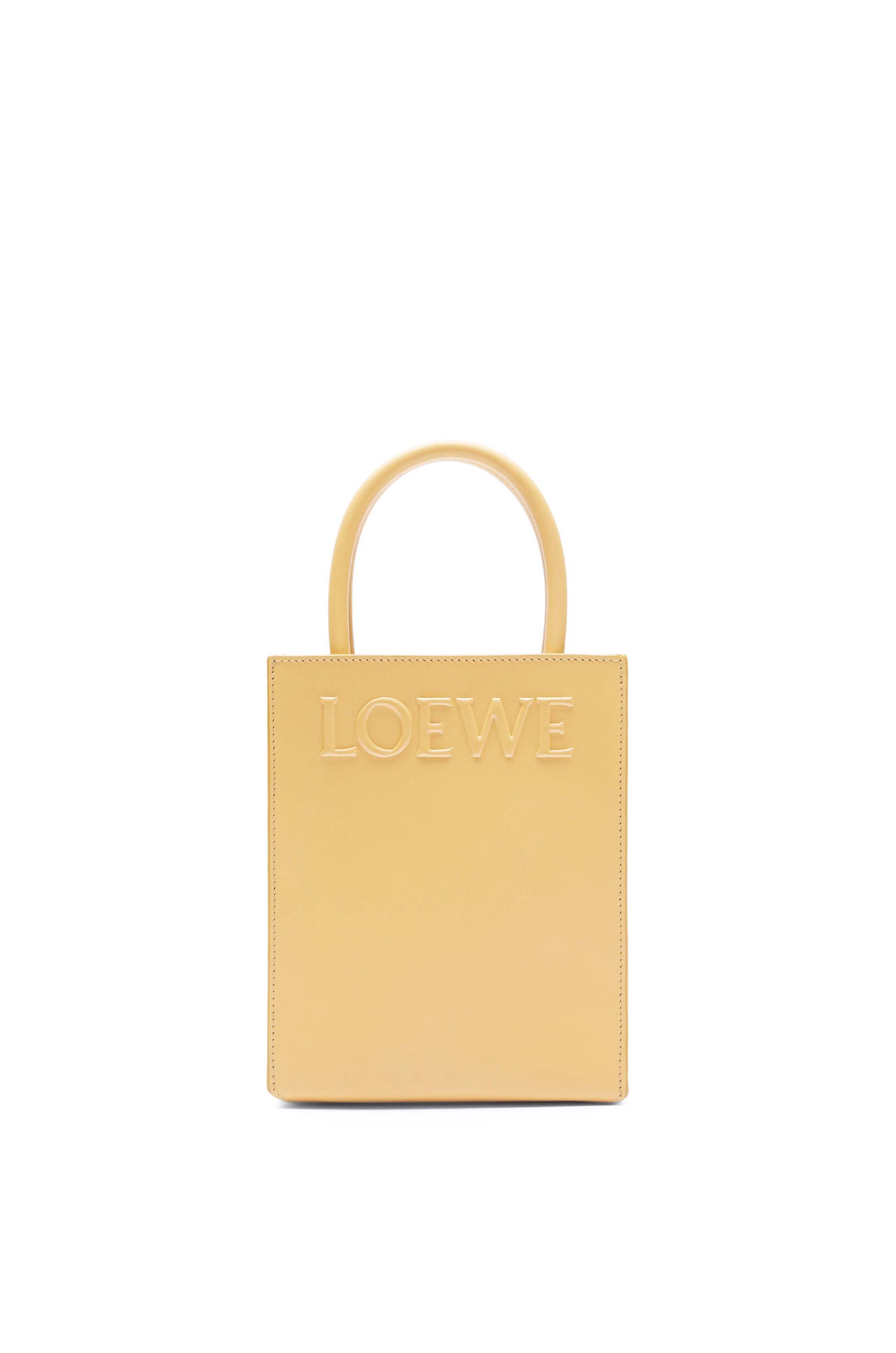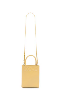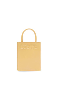 The LOEWE Standard Tote has an envelope construction on the base and can be carried by top handles or using the detachable shoulder strap. This mini version is crafted in sleek calfskin and has an embossed LOEWE logo across the front. - Hand, shoulder carry or crossbody - Detachable and adjustable shoulder strap - Interior slip pocket - Customisable with strap and personalisation charms - Herrington cotton canvas lining Details - Colour: Dark Butter - Metallic colour: Gold - Main material: Sleek Calf - Strap length: 107 - 117 cm - Handle drop: 10 cm - Weight: 0.4 kg - Height (cm): 21.5 - Width (cm): 17 - Depth (cm): 6 - Height (inch): 8.5 - Width (inch): 6.7 - Depth (inch): 2.4 - Model ID: A933S30X01 - CIL: 0010859692 - Made in: Spain