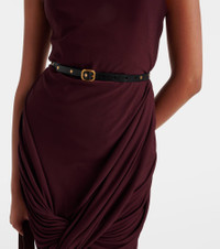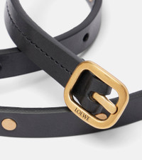 This belt from Loewe showcases a soft leather construction, complemented by gold-toned studs throughout. The design is secured by a gold-toned square buckle, showcasing the brand logo in engraved detail. Product Details - Material: calf leather - Lining: calf leather - Made in Spain - Designer color name: Black/Gold - Item color: black - Hardware color: gold - Closure: buckle fastening - Includes: dust bag, box - Item number: P01117859 Size & Fit - Width 1,4cm-0.5" - Buckle width 2,4cm-1"