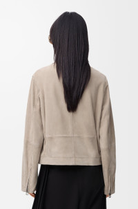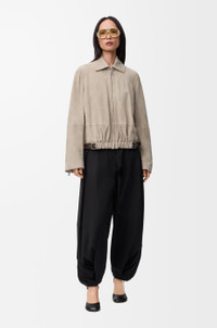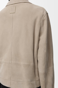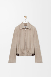 Jacket in lightweight suede goatskin featuring a gathered front with a contrast leather belt detail. - Regular fit, regular length - Classic collar - Zip front fastening, zipped cuffs - Seam pockets, inside welt pocket - Fully lined - LOEWE embossed leather patch placed at the back Colour: Dark Beige Main material: Suede Weight: 1.0 kg Made in: Spain Materials & care Main Material: 100% goat skin