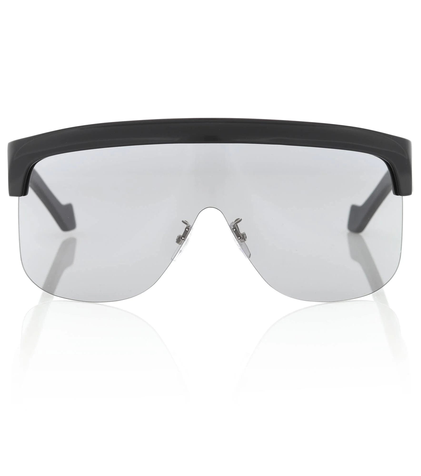 Inspired by futuristic masks, the Show sunglasses from Loewe are crafted into an oversized visor shape that curve into a D-silhouette. Made in Italy, this black design is trimmed with acetate and is engraved with the label's logo and Anagram motif. - material: acetate - lens colour: black - frame colour: black - tinted lenses - lens filter category 2 - Made in Italy - comes with cleaning cloth, comes in a logo-embossed case