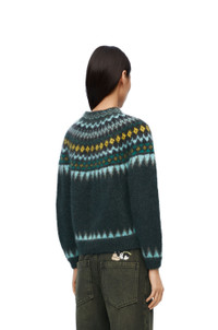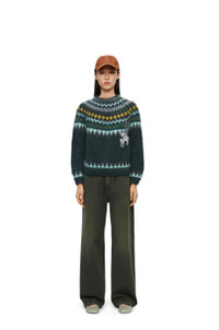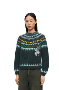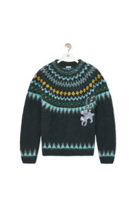 Sweater crafted in medium-weight mohair blend. This sweater is part of the LOEWE x Suna Fujita collaboration. - Hand knitted jacquard motifs - Regular fit - Regular length - Handmade and handstitched Lemur crochet patches at the front and on the left sleeve - Round neck - Ribbed collar, cuffs and hem Details - Colour: Dark Green - Main material: Mohair - Weight: 0.5 kg - Model ID: S359Y14KDX - Made in: Republic of Macedonia