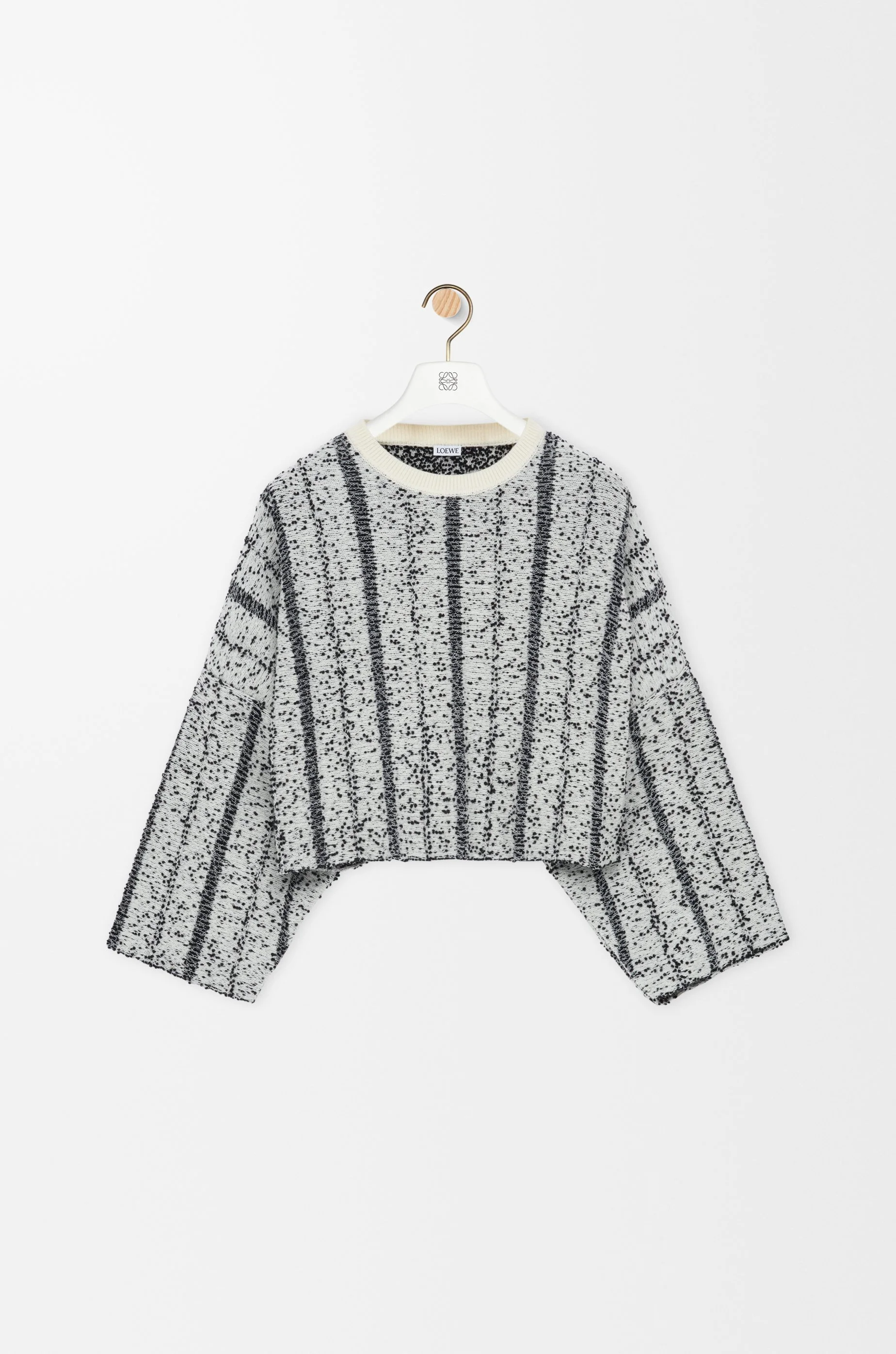 Sweater in medium-weight textured wool featuring a boxy silhouette. - Relaxed fit, short length - Jersey stitch - Round neck - Ribbed collar - Self-start cuffs and hem - LOEWE Anagram rubber patch placed at the back Colour: White/Black Main material: Wool/Polyamide Weight: 0.54 kg Made in: Italy Materials & care Main Material: 36% wool 34% polyamide 30% polyester