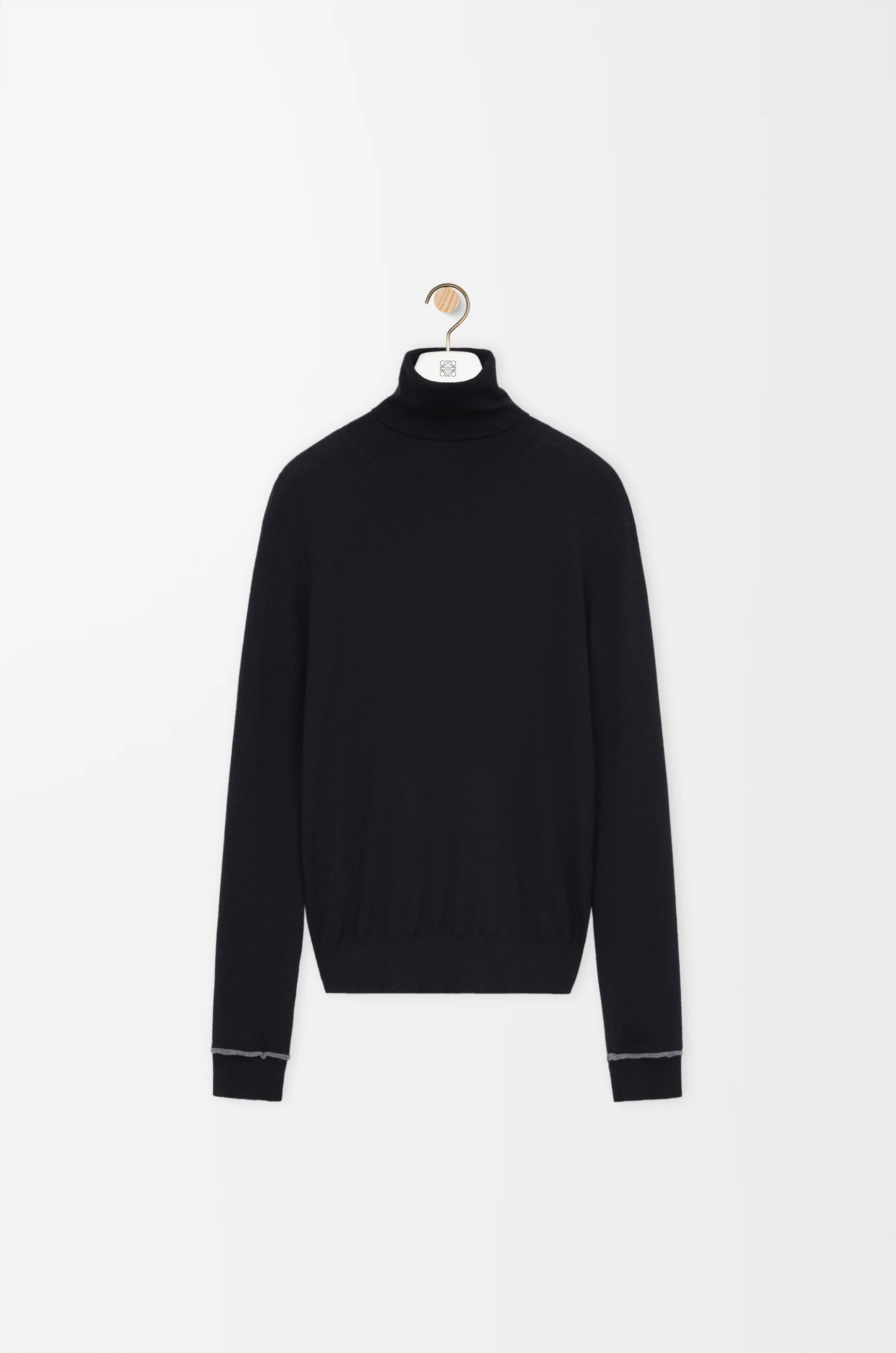 Sweater in lightweight wool featuring contrast rolling jersey piping on the cuffs. - Slim fit, regular length - Turtleneck - Ribbed collar, cuffs and hem - LOEWE jacquard placed at the back Colour: Navy/Grey Main material: Wool Weight: 0.14 kg Made in: Italy Materials & care Main Material: 100% wool