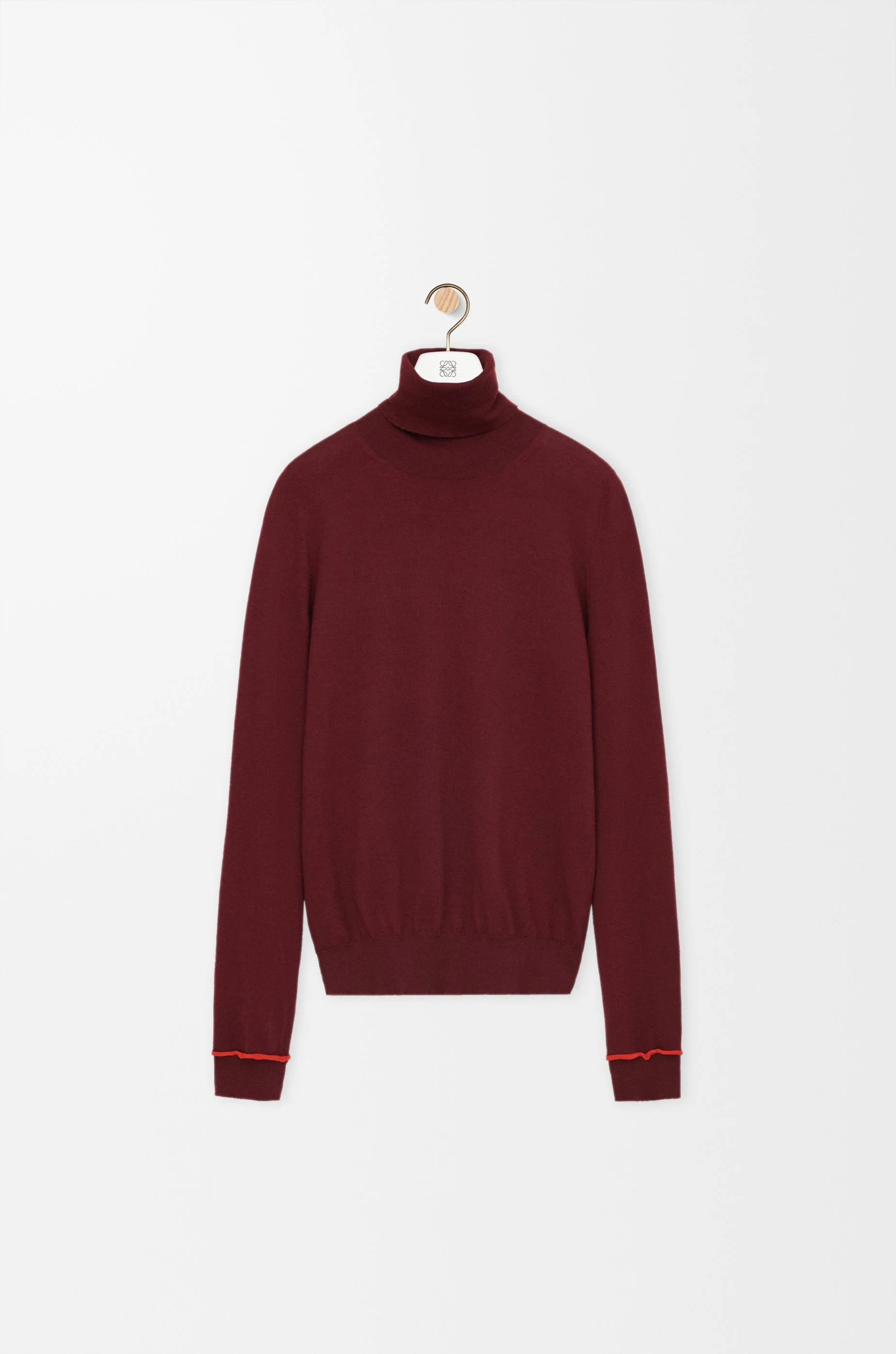 Sweater in lightweight wool featuring contrast rolling jersey piping on the cuffs. - Slim fit, regular length - Turtleneck - Ribbed collar, cuffs and hem - LOEWE jacquard placed at the back Colour: Burgundy/Orange Main material: Wool Weight: 0.14 kg Made in: Italy Materials & care Main Material: 100% wool