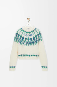 Sweater in medium-weight wool blend featuring a boxy silhouette and a Fair Isle pattern with a sequinned yarn. - Relaxed fit, regular length - Round neck - Ribbed collar, cuffs and hem - LOEWE jacquard placed at the front Colour: White/Mint Main material: Wool/polyamide Weight: 0.42 kg Made in: Italy Materials & care Main Material: 66% wool 28% polyamide 5% polyester 1% elastane