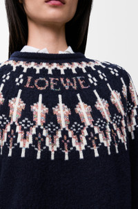 Sweater in medium-weight wool blend featuring a boxy silhouette and a Fair Isle pattern with a sequinned yarn. - Relaxed fit, regular length - Round neck - Ribbed collar, cuffs and hem - LOEWE jacquard placed at the front Colour: Navy/Multicolor Main material: Wool/polyamide Weight: 0.42 kg Made in: Italy Materials & care Main Material: 66% wool 28% polyamide 5% polyester 1% elastane