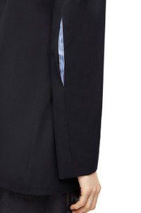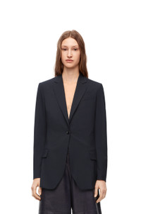 Tailored jacket in lightweight fluid tailoring wool. - Regular fit - Regular length - Single breasted - Cut-out slits at the elbows revealing striped cotton poplin lining - Notch lapels - Shoulder pads - Chest welt pocket - Flap pockets - Curved hem - Striped cotton poplin lining - LOEWE contrasted engraved button Details - Colour: Dark Blue - Main material: Wool - Weight: 0.5 kg - Model ID: S359Y03X45 - Made in: Italy