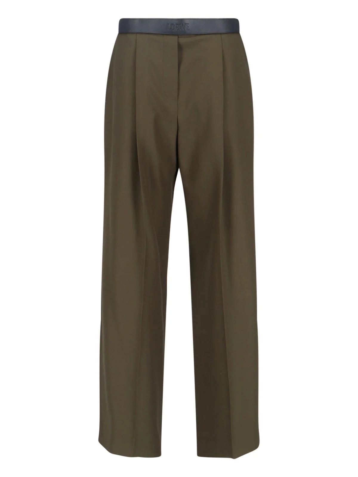 LOEWE TAILORED TROUSERS IN GREEN WOOL WITH ELASTIC MID WAISTBAND, EMBOSSED LOGO ON THE FRONT STRAP, FRONT PIN TUCKS, TWO SIDE POCKETS, BACK WELT POCKET, STRAIGHT LEG. PRODUCT INFO PRODUCT CODE S359Y04XHN4160 COMPOSITION: 95% WOOL, 5% CALF LEATHER SIZE AND FIT: REGULAR FIT MADE IN: ITALY