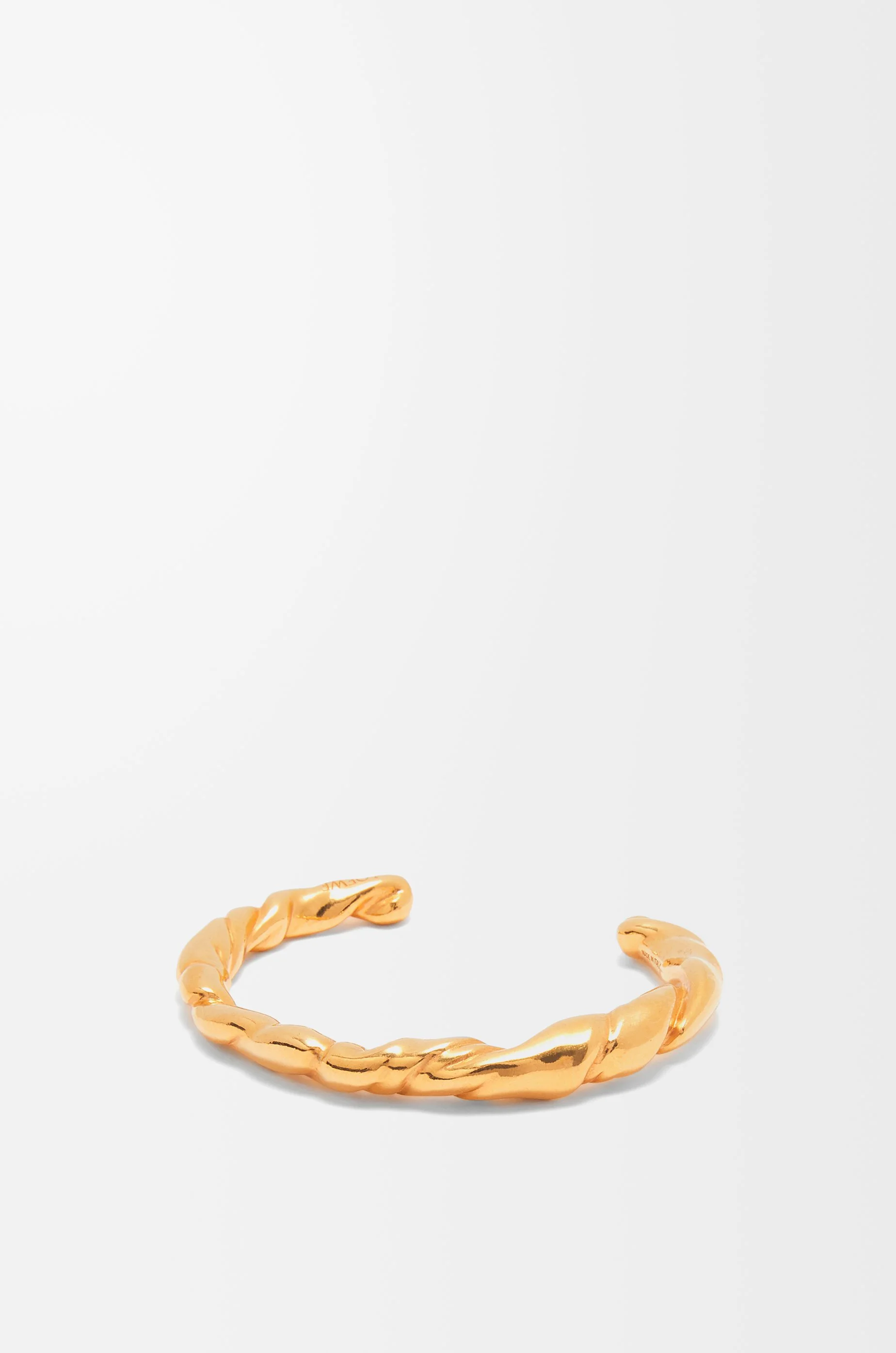 A cuff inspired by the twists of nappa leather. This thin version is crafted in sterling silver with a 24k gold finish. - 925/1000 Silver - Engraved with LOEWE - Small: 14cm wide with a 2.7cm opening - Medium: 15cm wide with a 2.85cm opening - Large: 16cm wide with a 3cm opening Details - Colour : Gold - Metallic colour : Gold - Main material : Sterling Silver - Weight : 0.43 kg - Height (cm) : 5.1 - Width (cm) : 6.5 - Depth (cm) : 0.9 - Height (inch) : 2 - Width (inch) : 2.6 - Depth (inch) : 0.4 - Model ID : J917240X10 - Made in : Italy