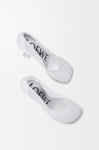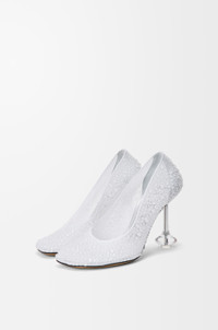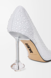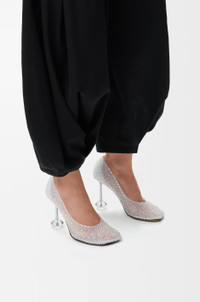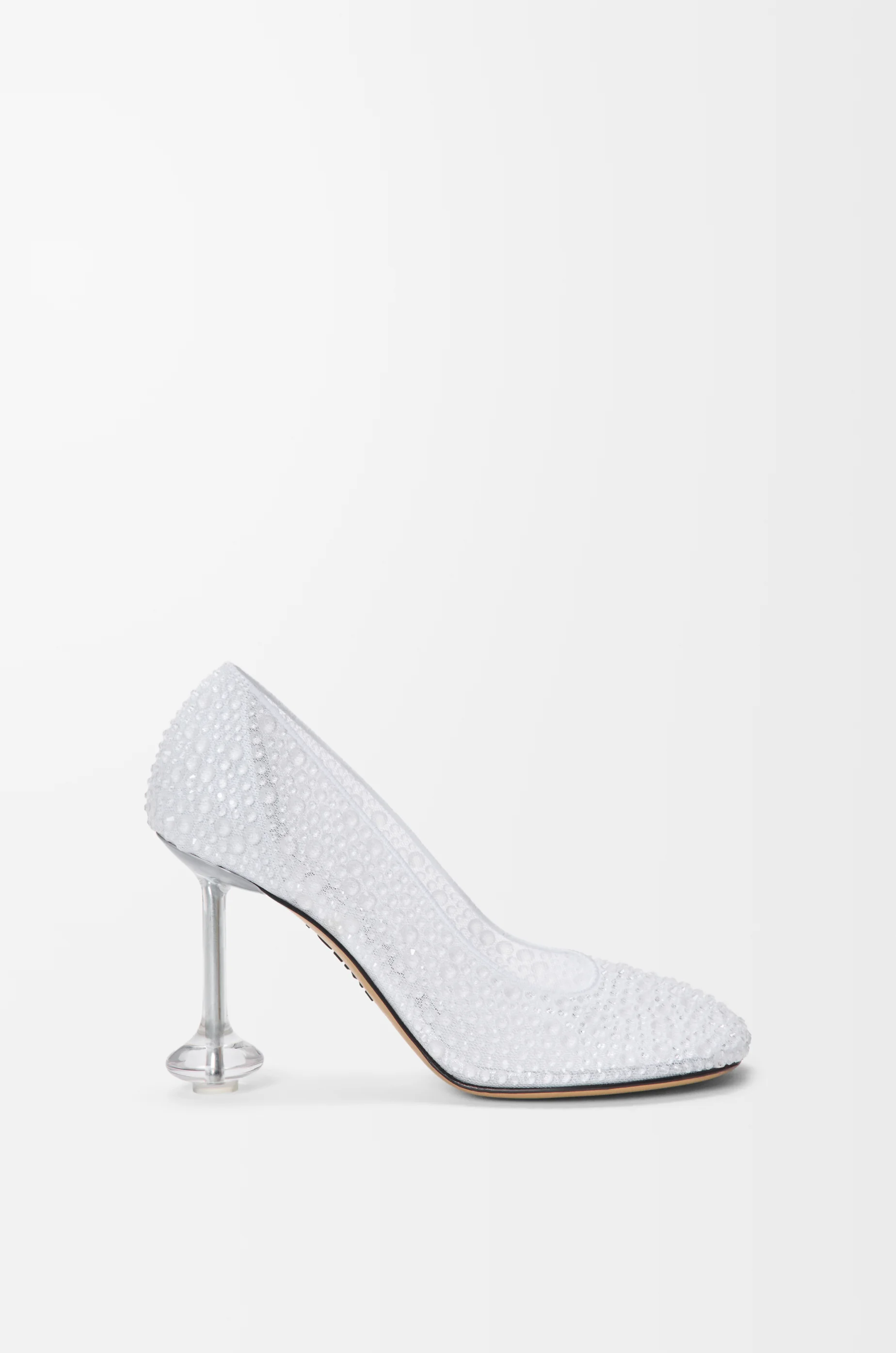 Pump in unlined mesh embellished with droplet-inspired rhinestones featuring a petal-shaped toe and a clear Toy heel. - 90mm heel - Leather insole and outsole Colour: Transparent Main material: Strassed Mesh Weight: 0.55 kg Made in: Italy