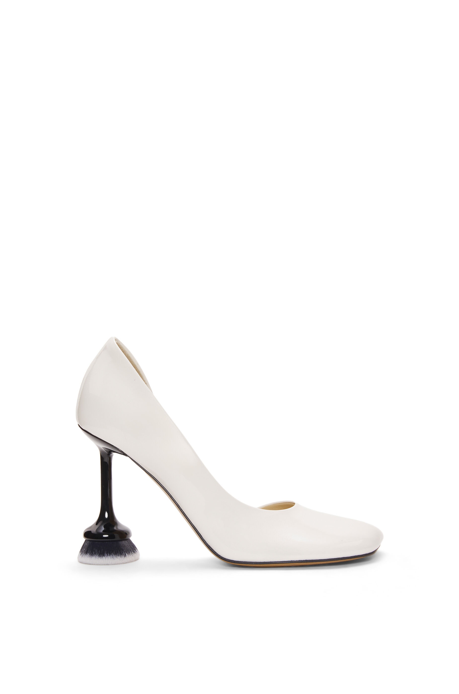 "Objet Trouvé" D'Orsay pump in soft patent lambskin, featuring a special kitten heel crafted with a real make-up brush, as well as our signature petal-shaped toe and lacquered Toy heel. - 90mm heel height - Leather lining and leather outsole Details - Colour: Almost Optic - Main material: Soft Patent Lambskin - Heel height: 10 - Weight: 0.43 kg - Model ID: L814S01XAD - Made in: Italy