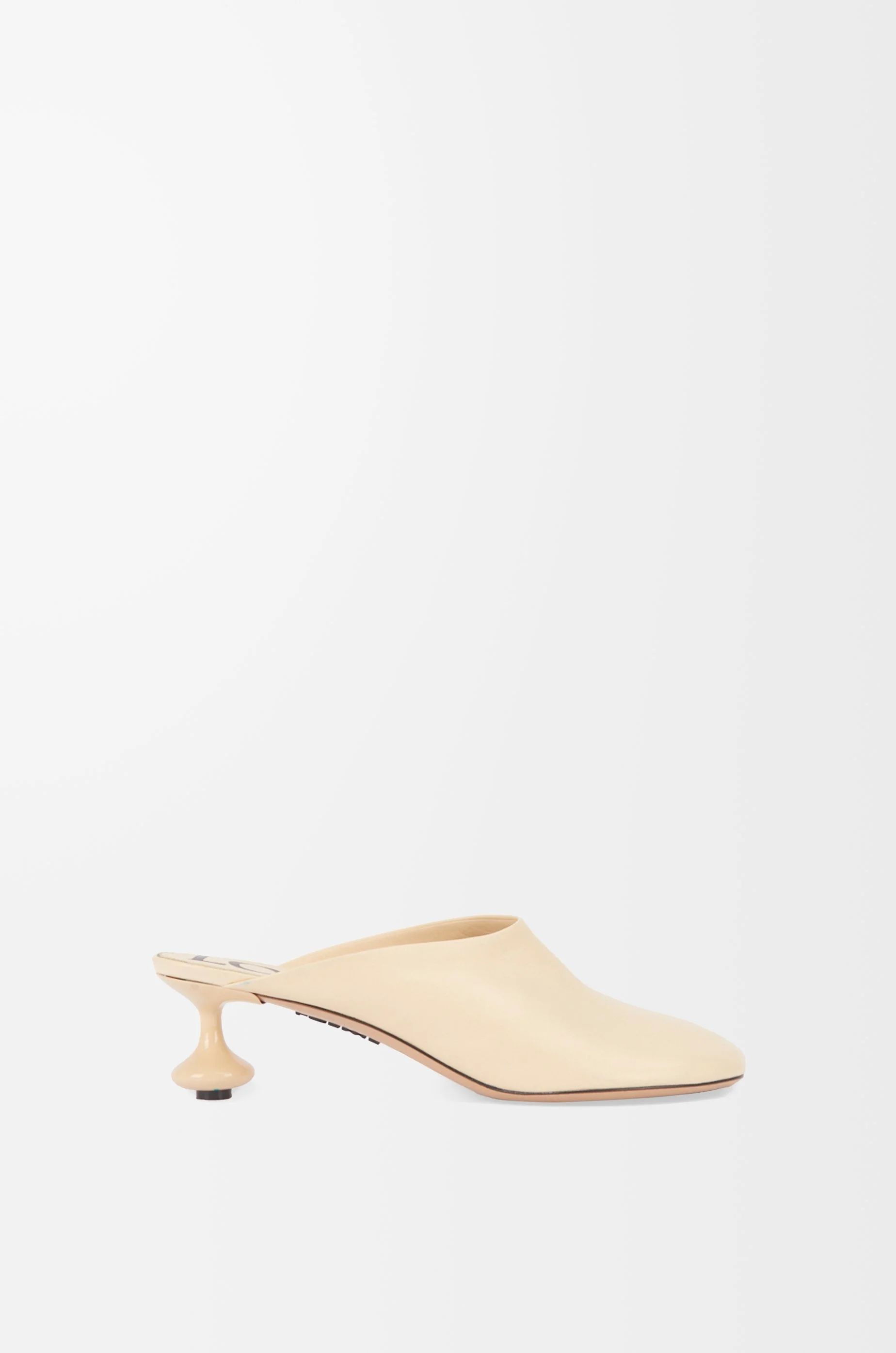 Mules in goatskin with a petal shaped toe and lacquered signature toy heel. The SS23 shoe collection plays on tension and contrast: handcraft clashes with a fetish attitude and natural materials collide with the technical. Key details include playful heels, graphic logos and asymmetric toes and straps. - 45mm heel Details - Colour: Oat Milk - Main material: Goatskin - Heel height: 6 - Weight: 0.4 kg - Model ID: L814379X28 - Made in: Italy
