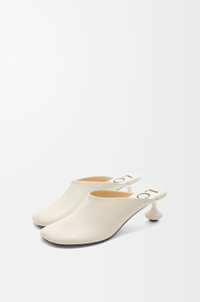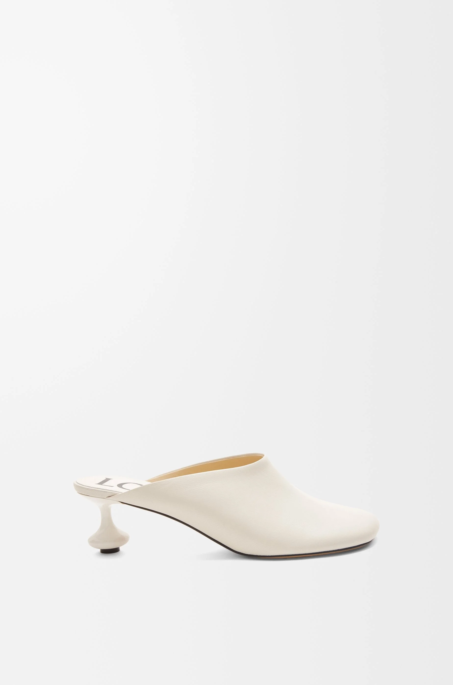 Mules in goatskin with a petal shaped toe and lacquered signature toy heel. The SS23 shoe collection plays on tension and contrast: handcraft clashes with a fetish attitude and natural materials collide with the technical. Key details include playful heels, graphic logos and asymmetric toes and straps. - 45mm heel Details - Colour: White - Main material: Goatskin - Heel height: 6 - Weight: 0.4 kg - Model ID: L814379X28 - Made in: Italy