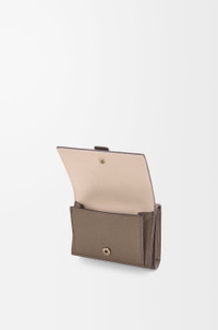 Trifold wallet in soft grained calfskin. - Six card slots, one large pocket - One coin compartment with snap button closure - Snap button closure - Calfskin lining - Embossed Anagram Colour: Taupe/Talc Metallic colour: Gold Main material: Soft Grained Calf Weight: 0.11 kg Height: 7.8 cm Width: 10.2 cm Depth: 3.8 cm Made in: Spain