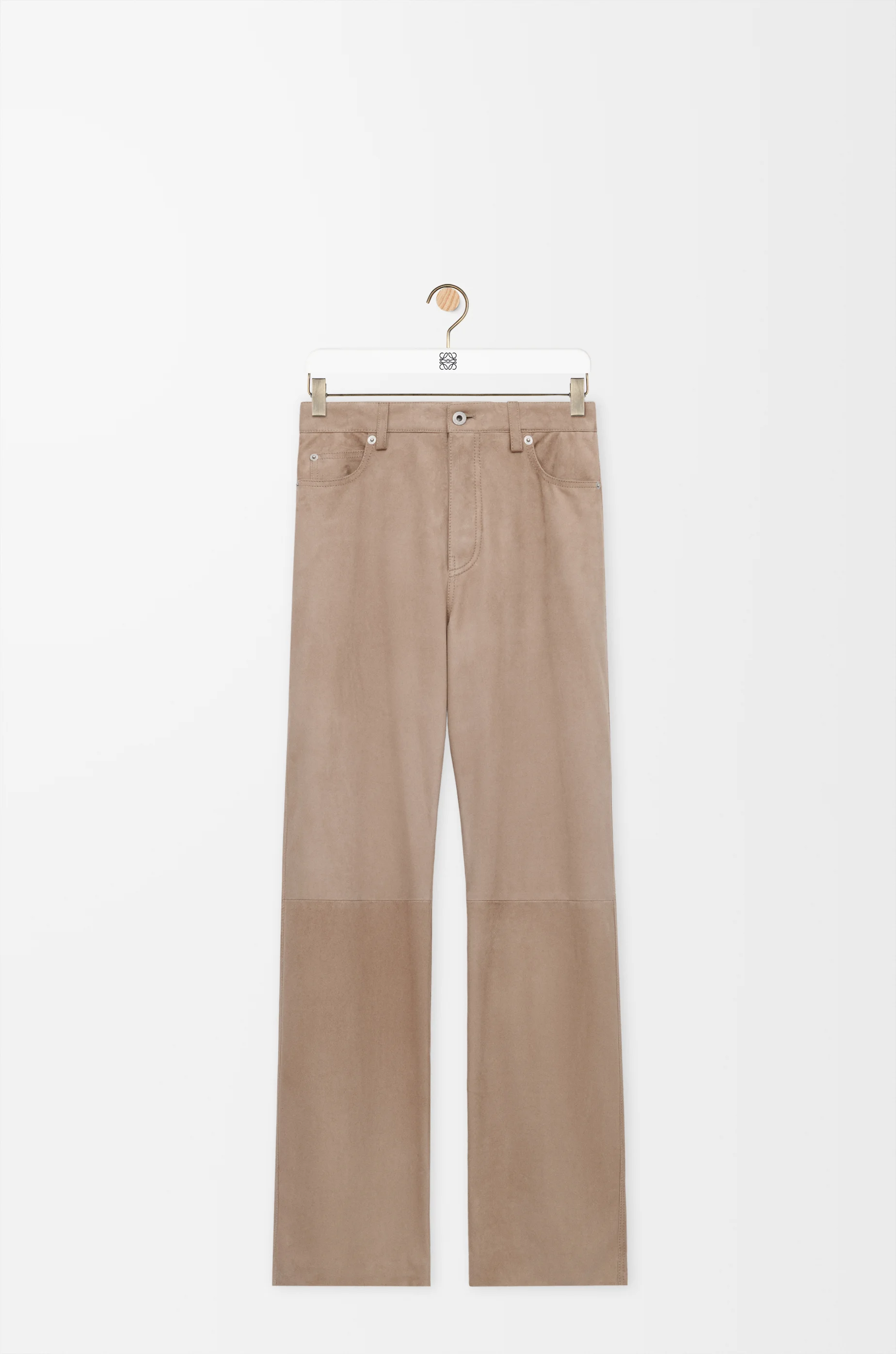 Trousers in lightweight suede goatskin. - Regular fit, regular length - Mid waist, straight leg - Five pocket style - Concealed button fly - Back cinch - LOEWE embossed leather patch placed at the back Colour: Dark Beige Main material: Suede Weight: 0.55 kg Made in: Spain Materials & care Main Material: 100% goat skin
