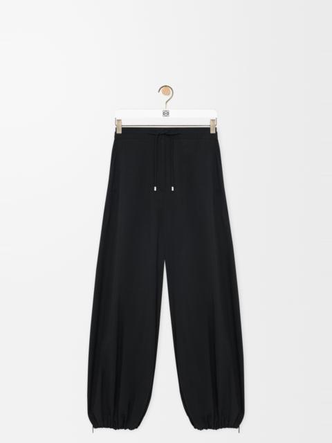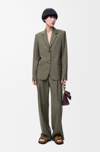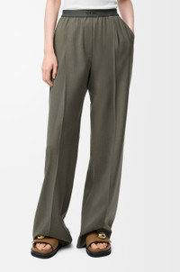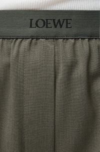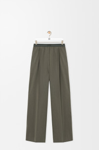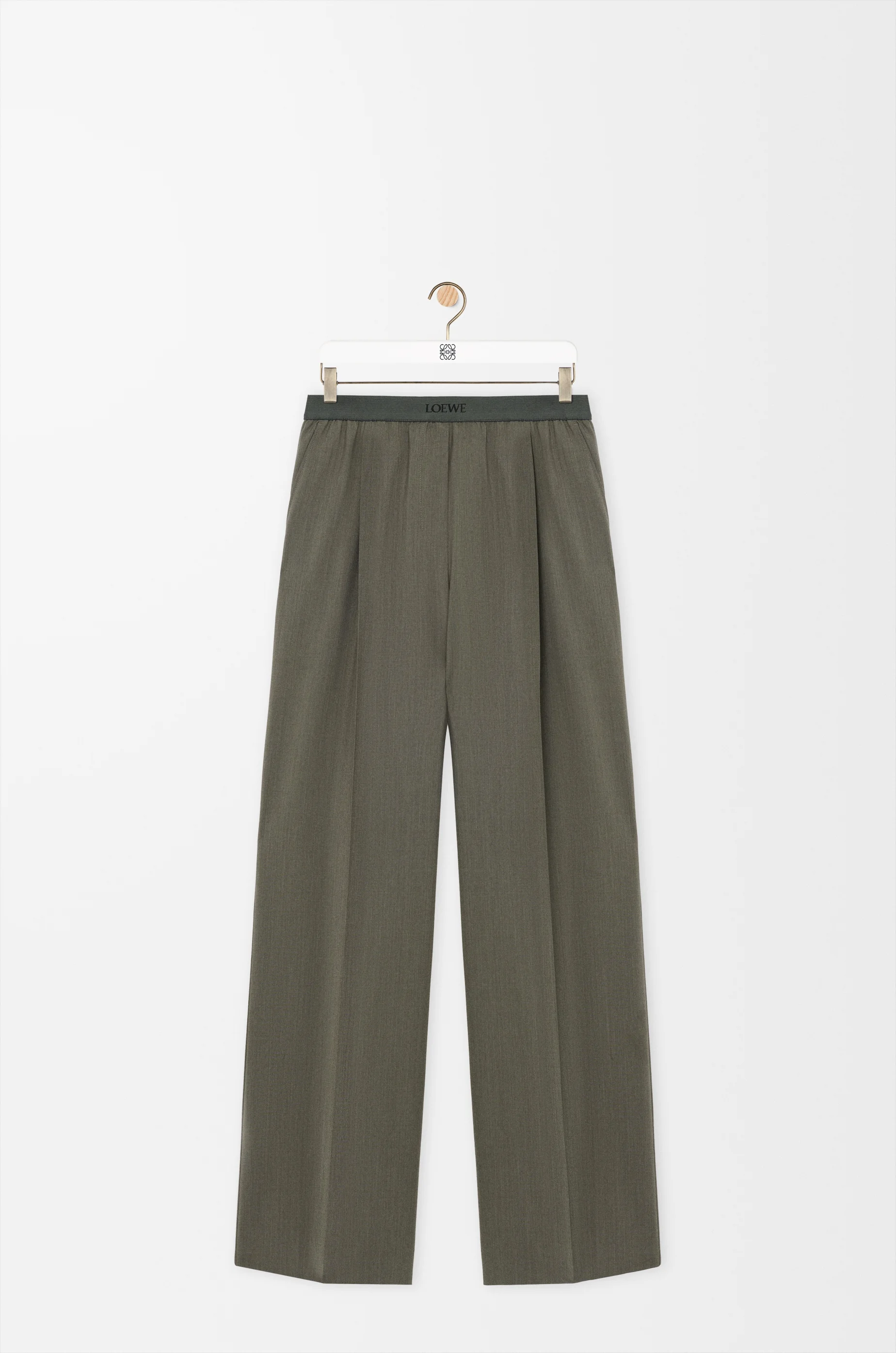 Trousers in lightweight wool tailoring featuring an elasticated LOEWE jacquard waistband. - Relaxed fit, regular length - Mid waist, straight leg - Mock fly - Slash pockets, rear welt pocket - Pressed creases at the front and back Colour: Khaki Green Main material: Wool Weight: 0.7 kg Made in: Italy Materials & care Main Material: 100% wool
