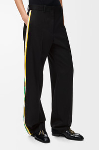 Trousers in lightweight wool twill tailoring featuring multi-layered detailing at the sides with archive LOEWE graphic prints. - Regular fit, regular length - Mid waist, straight leg - Concealed zip fly - Seam pockets, buttoned rear jet pockets - Pressed creases at the front and back - Double L embroidery placed at back Colour: Black Main material: Wool Weight: 0.64 kg Made in: Italy Materials & care Main Material: 65% wool 34% viscose 1% polyester