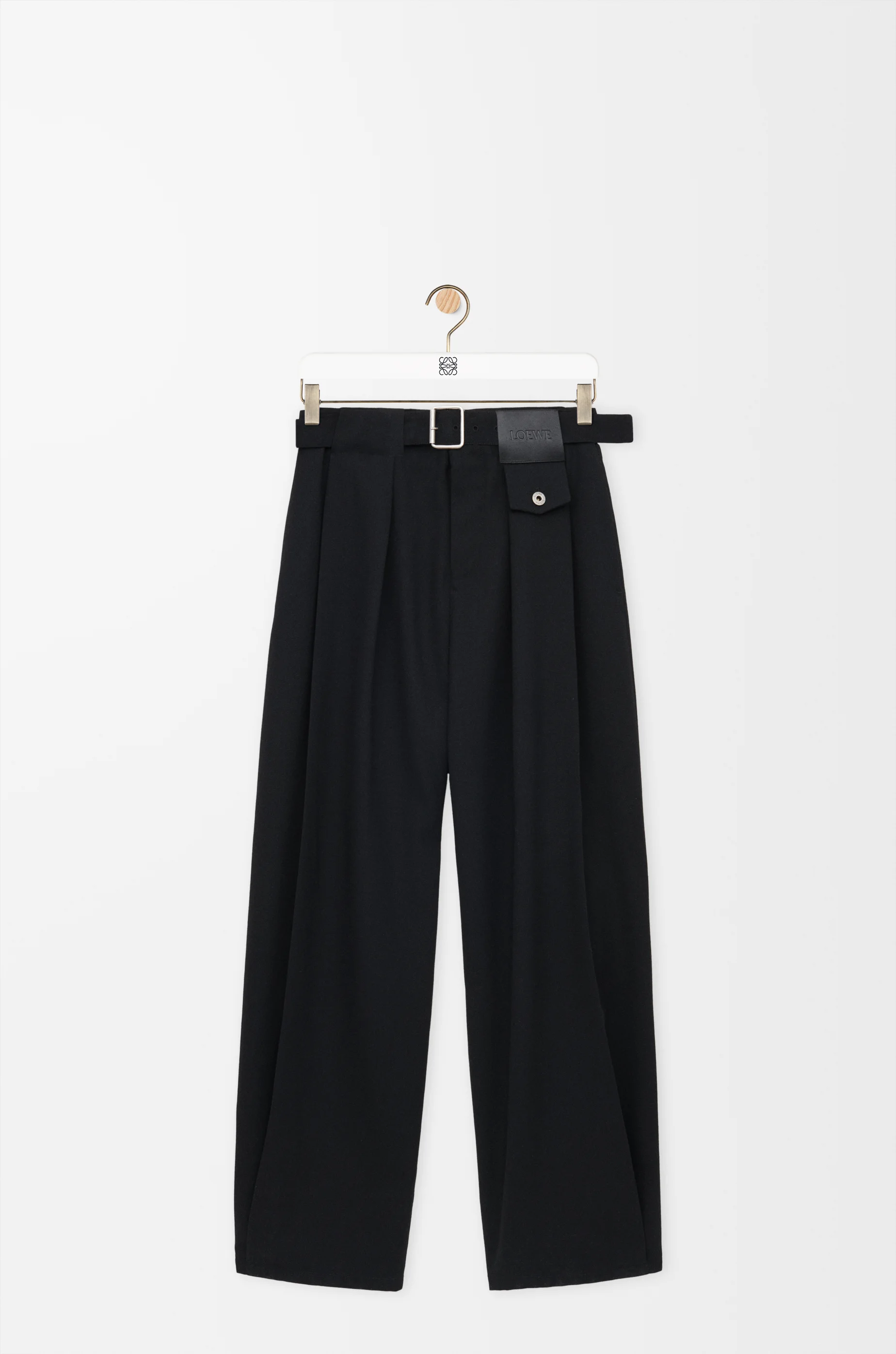 Trousers in lightweight crepe wool tailoring featuring an adjustable fabric belt and pleats at the front. - Relaxed fit, regular length - Mid waist, loose leg - Concealed button fly - Buttoned coin pocket, seam pockets and rear patch pocket - LOEWE embossed leather patch placed at the front Colour: Black Main material: Wool Weight: 0.45 kg Made in: Italy Materials & care Main Material: 100% wool