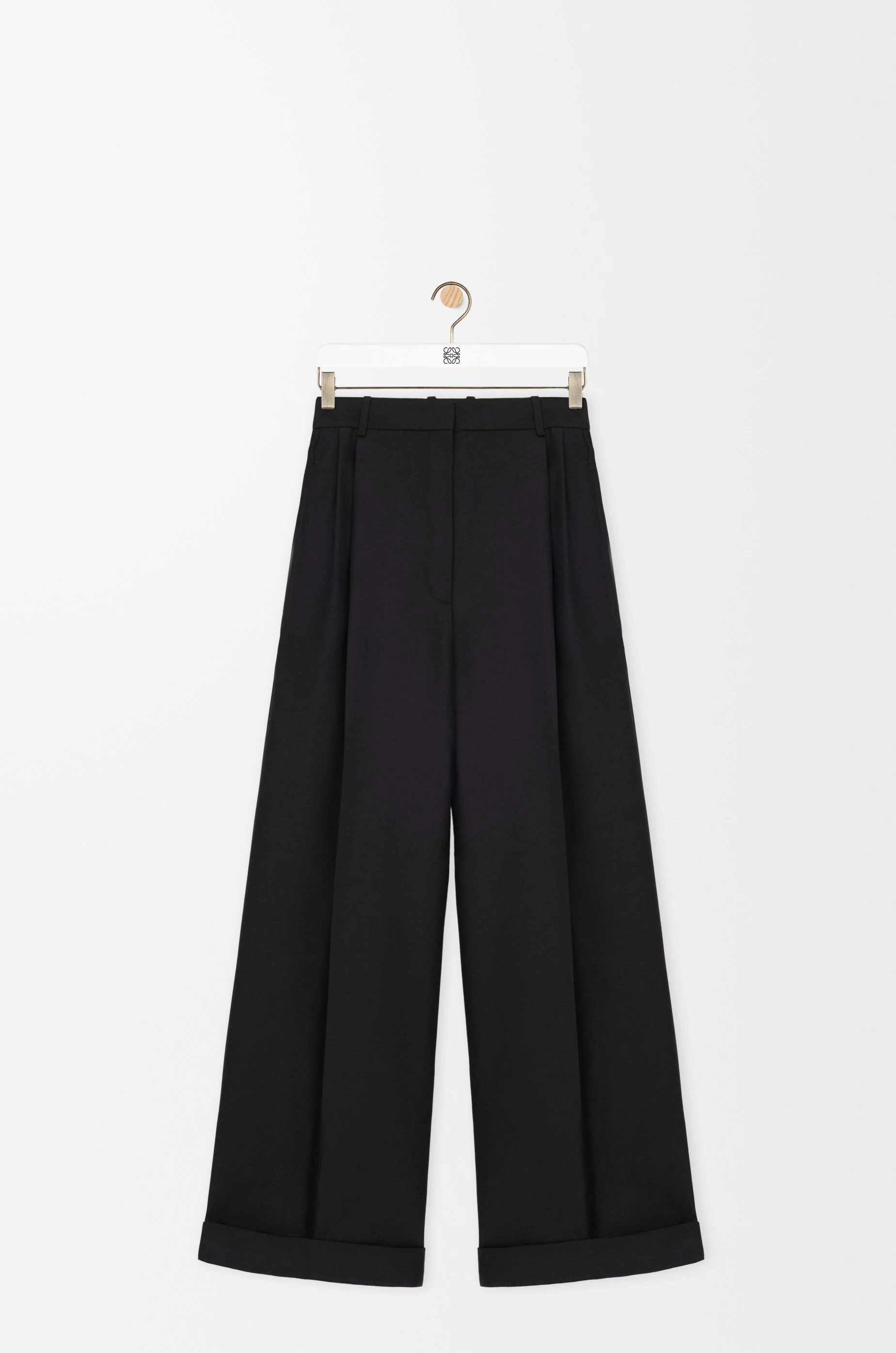Trousers in medium-weight wool and silk tailoring. - Regular fit, regular length - High waist, wide leg - Concealed zip fly - Seam pockets, rear jet pocket - Pressed creases at the front and back - Cuffed hem - Anagram embroidery placed at the back Colour: Black Main material: Wool/Silk Weight: 0.4 kg Made in: Italy Materials & care Main Material: 71% wool 29% silk