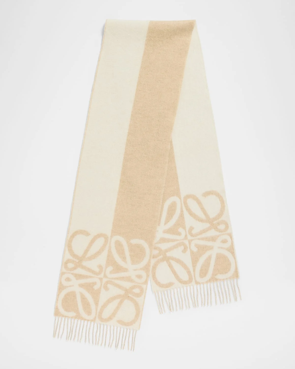 Loewe scarf featuring a twotone Anagram jacquard pattern. Approx. 70"L x 11"W Fringed edges May be styled multiple ways Wool/cashmere Made in United Kingdom