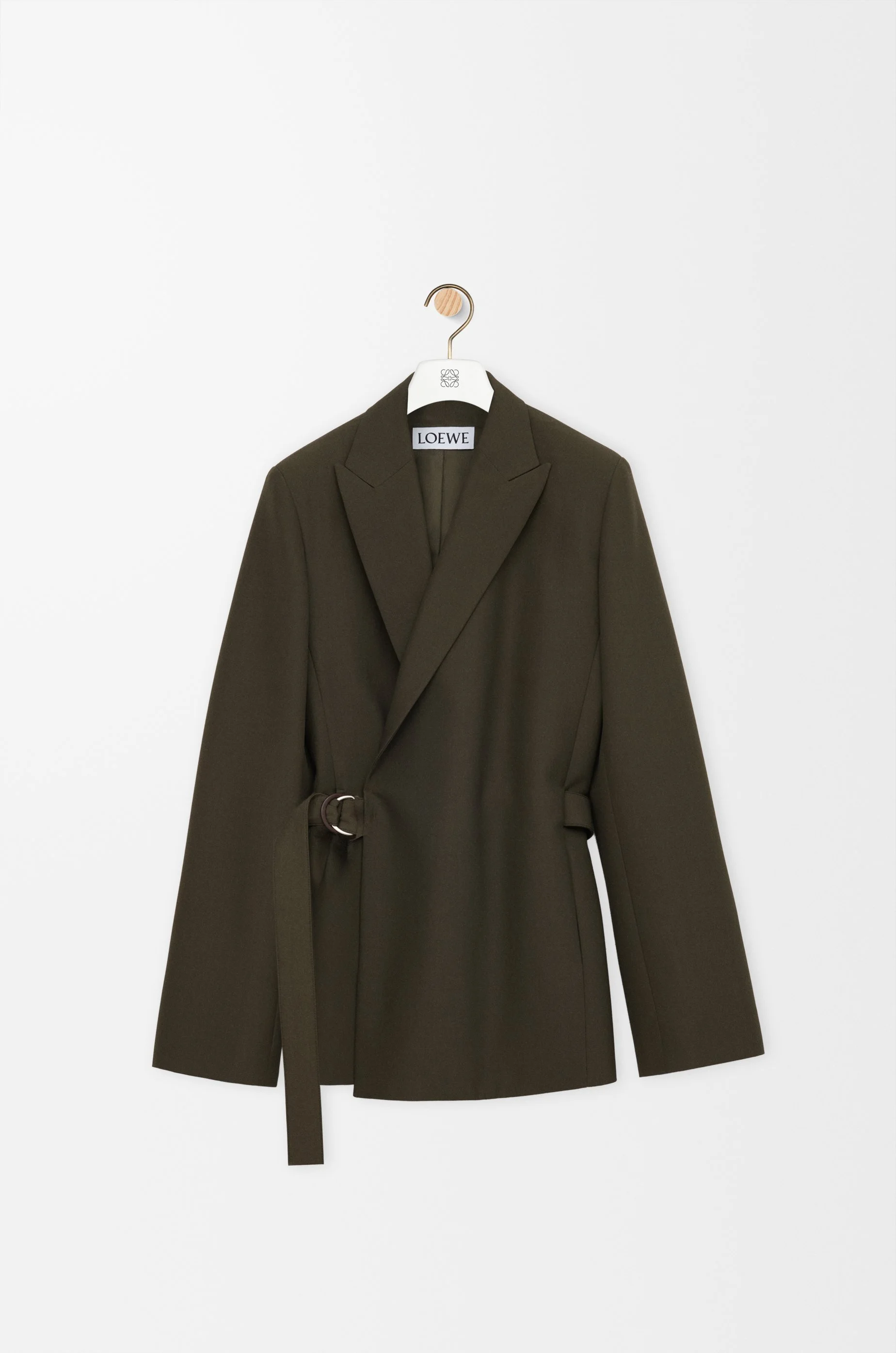 Jacket in lightweight fluid wool tailoring featuring a draped wrap front with a belt at the side. - Regular fit, regular length - Peak lapel - Buttoned cuffs - Seam pockets - Fully lined - LOEWE engraved D-ring Colour: Khaki Green Main material: Wool Weight: 0.86 kg Made in: Italy Materials & care Main Material: 100% wool