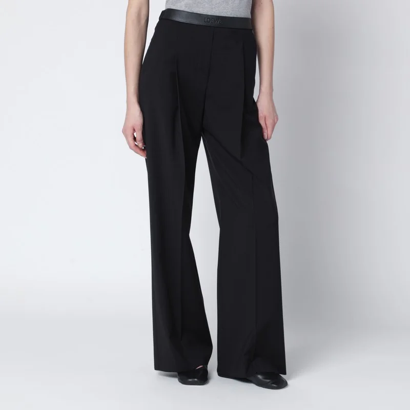 Loewe trousers in black wool, featuring a straight, fluid leg, leather waistband with embossed logo lettering on the front, regular fit, two side pockets, one back welt pocket, faux fly, and pressed pleats on the front and back.