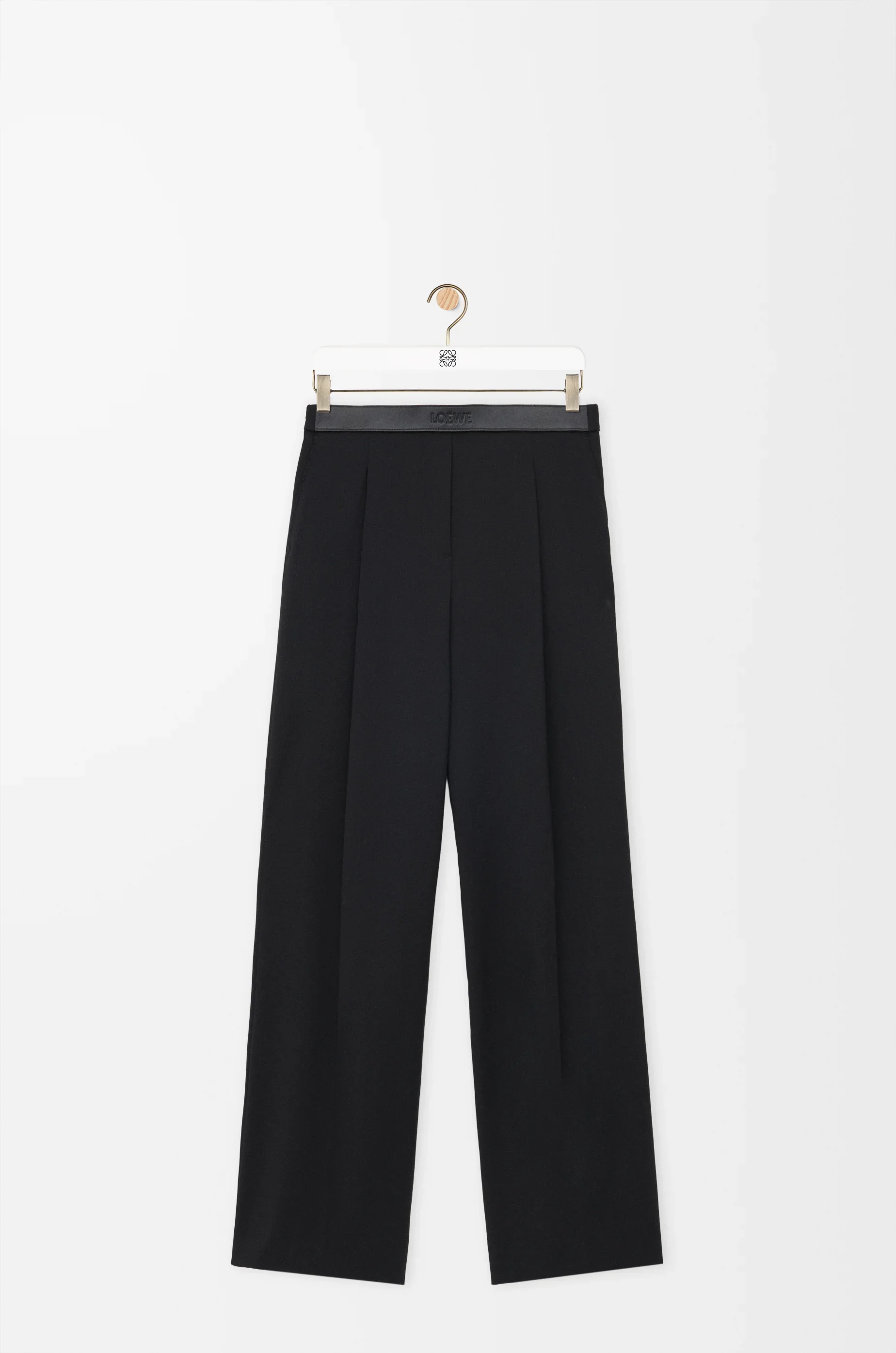 Trousers in lightweight fluid wool tailoring featuring a LOEWE-embossed leather waistband at the front. - Regular fit, regular length - Mid waist, straight leg - Mock fly - Slash pockets, rear welt pocket - Pressed creases at the front and back Colour: Black Main material: Wool Weight: 0.24 kg Made in: Italy Materials & care Main Material: 100% wool