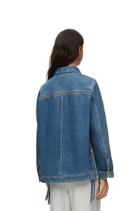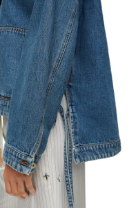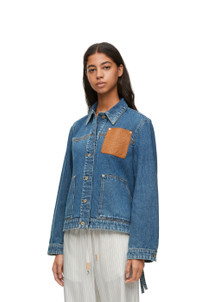 Workwear jacket crafted in medium-weight washed cotton denim. - Relaxed fit - Regular length - Classic collar - Buttoned cuffs - Button front fastening - Two patch pockets - Signature four-row tobacco topstitching - Asymmetric front to back hem with ties at the side - LOEWE Anagram embossed leather patch pocket placed on the chest Details - Colour: Jeans Blue - Main material: Cotton - Weight: 0.8 kg - Model ID: S359Y50X55 - Made in: Italy