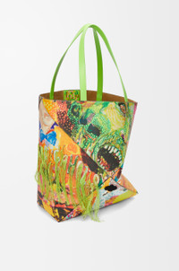 The Puzzle Fold tote is a soft and lightweight design inspired by the iconic bag, whose geometric lines are reimagined as graphic and architectural panels engineered to fold completely flat. This XL version is crafted in classic calfskin and features an artwork collage print enriched with leather marquetry, carved-out details, carpet stitching, embroidery, fringes and rhinestones. This bag is part of a special Richard Hawkins x LOEWE collaboration. - Shoulder or hand carry - Suede lining - Gold embossed LOEWE Details - Colour : Vivid Green/Multicolor - Main material : Calfskin - Handle drop : 26 cm - Weight : 0.75 kg - Height (cm) : 41 - Width (cm) : 42 - Depth (cm) : 18 - Height (inch) : 16.1 - Width (inch) : 16.5 - Depth (inch) : 7.1 - Model ID : B779Q18X29 - CIL : - 0011142700 - Made in : Spain