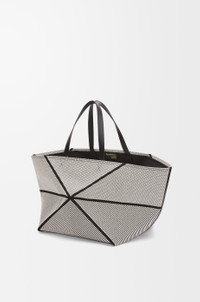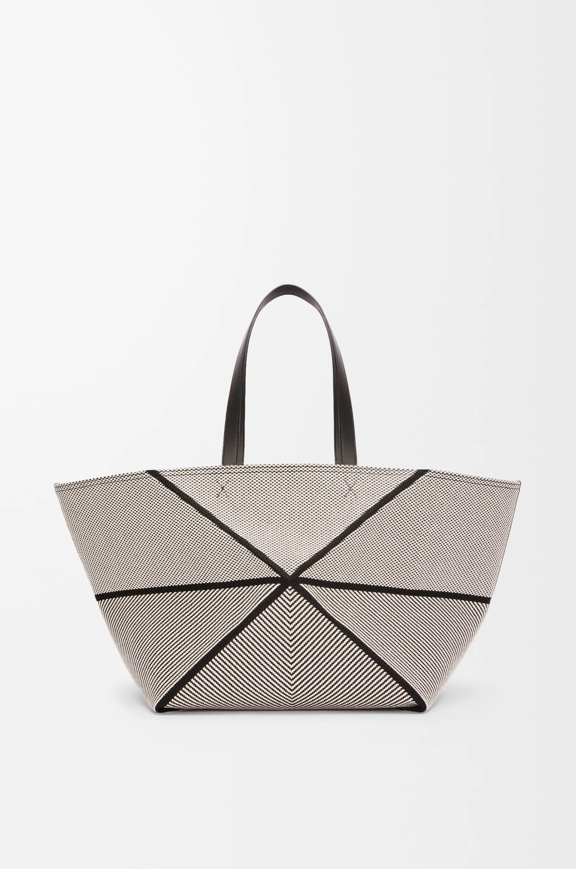 The Puzzle Fold tote is a soft and lightweight design inspired by the iconic bag, whose geometric lines are reimagined as graphic and architectural panels engineered to fold completely flat. This special edition created in collaboration with US-based artist Kay Sekimachi showcases her pioneering work in loom weaving, inspired by her 1999 linen series Takarabako. This XXL version is crafted in cotton jacquard with calfskin handles. - Shoulder or hand carry - Textile lining - Gold embossed Kay Sekimachi LOEWE Details - Colour : Natural/Black - Main material : Textile - Weight : 1.086 kg - Height (cm) : 36.5 - Width (cm) : 73 - Depth (cm) : 36.5 - Height (inch) : 14.4 - Width (inch) : 28.7 - Depth (inch) : 14.4 - Model ID : A779PFMX26 - CIL : - 0011124849 - Made in : Spain