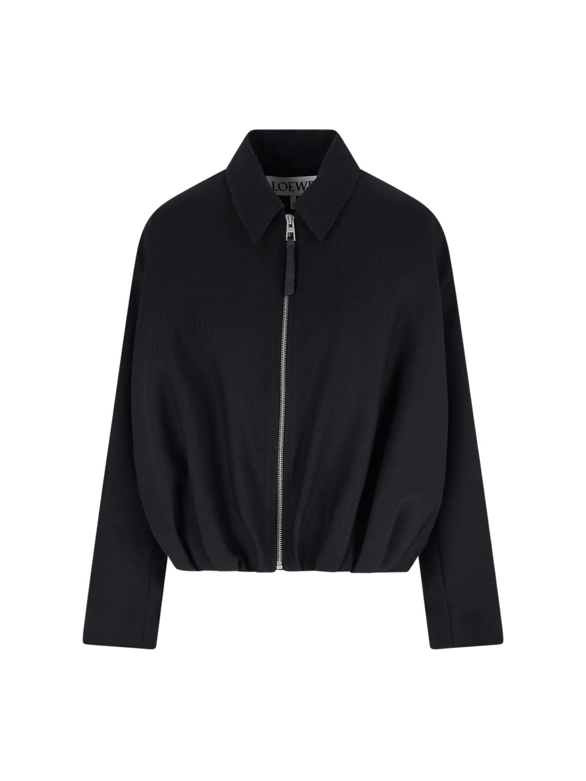 LOEWE BLACK WOOL ZIP JACKET WITH CLASSIC COLLAR, FRONT ZIP CLOSURE, LONG SLEEVES, DRAPED BACK, LOGO TAG ON THE BACK, LEATHER TRIMS, STRAIGHT HEM. PRODUCT INFO PRODUCT CODE S359Y02XGN1100 COMPOSITION: 94% WOOL, 6% CALF LEATHER SIZE AND FIT: REGULAR FIT MADE IN: ITALY