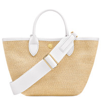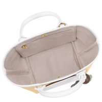 Product Details Reference : 10307HGY007 Dimensions : 6.3 in (L - measured at the base of the bag) x 7.1 in (H) x 4.7 in (W) Material : Canvas with straw effect Metallic Hardware : Very pale gold color Trimming : Cowhide leather Weight : 0.98 lb Closing : Zipper and snap button Exterior details Strap : Adjustable and removable