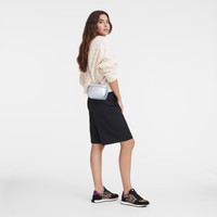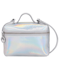 Product Details Reference : 10187HDZ023 Dimensions : 6.3 in (L) x 3.9 in (H) x 4.3 in (W) Material : Holographic effect canvas Metallic Hardware : Silver color Trimming : Calfskin Leather Lining : Polyester - Jacquard, Longchamp ribbons Weight : 0.30 lb Exterior details Strap Height : 55 cm / 21.7 in Handle Height : 4 cm / 1.6 in Closing : Zipper interior details Flat pocket : 1