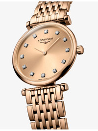 PRODUCT DETAILS - Longines Rose PVD Coated Stainless-Steel And 0. 048ct Diamond Quartz Watch - Case material: 100% stainless steel; 100% rose PVD coating - Strap material: 100% stainless steel; 100% rose PVD coating - Crown material: 100% stainless steel; 100% rose PVD coating - Style Number: L4.209.1.90.8 - Movement type: quartz - Fastening: triple safety folding clasp and push-piece opening mechanism - Dial: round, red - Hands: pink hands - Index: diamond indexes - Glass: scratch-resistant sapphire crystal - Calibre: L209 - Stones: 12 Wesselton VS-SI diamonds - Carat weight: 0.048ct total - Case thickness: 4.30mm - Case diameter: 24.00mm - Water resistance: 3 bar / 3 atm / 30m / 100ft - Made in Switzerland - Warranty: 2 years, warranty card diamond certificate to be included with return. Ref: R04473141