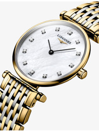 PRODUCT DETAILS - Longines Yellow PVD Coated Stainless-Steel And 0.048ct Diamond Quartz Watch - Case material: 100% stainless steel; 100% yellow PVD coating - Strap material: 100% stainless steel; 100% yellow PVD coating - Crown material: 100% stainless steel; 100% yellow PVD coating - Style Number: L4.209.2.87.7 - Movement type: quartz - Fastening: triple safety folding clasp and push-piece opening mechanism - Dial: round, white mother-of-pearl - Hands: Black hands - Index: diamond indexes - Glass: scratch-resistant sapphire crystal - Calibre: L209 - Stones: 12 Wesselton VS-SI diamonds - Carat weight: 0.048ct total - Case thickness: 4.30mm - Case diameter: 24.00mm - Water resistance: 3 bar / 3 atm / 30m / 100ft - Made in Switzerland - Warranty: 2 years, warranty card diamond certificate to be included with return. Ref: R04473135
