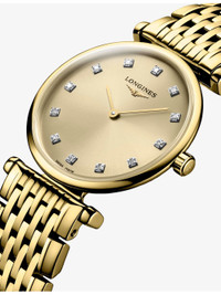 PRODUCT DETAILS - Longines Yellow PVD Coated Stainless-Steel And 0.048ct Diamond Quartz Watch - Case material: 100% stainless steel; 100% yellow PVD coating - Strap material: 100% stainless steel; 100% yellow PVD coating - Crown material: 100% stainless steel; 100% yellow PVD coating - Style Number: L4.209.2.37.8 - Movement type: quartz - Fastening: triple safety folding clasp and push-piece opening mechanism - Dial: round, Gilt - Hands: Gilt hands - Index: diamond indexes - Glass: scratch-resistant sapphire crystal - Calibre: L209 - Stones: 12 Wesselton VS-SI diamonds - Carat weight: 0.048ct total - Case thickness: 4.30mm - Case diameter: 24.00mm - Water resistance: 3 bar / 3 atm / 30m / 100ft - Made in Switzerland - Warranty: 2 years, warranty card diamond certificate to be included with return. Ref: R04473140