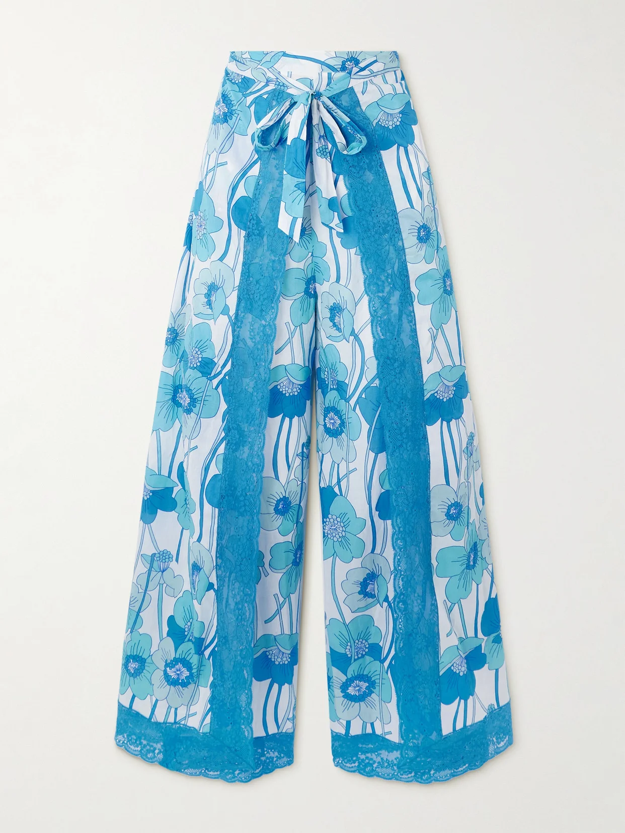 Loretta Caponi's 'Alexis' pants are made from layers of cotton-voile that are patterned with vibrant flowers. Designed in a floaty shape that ties at the waist, they have wide legs traced with scalloped lace trims.