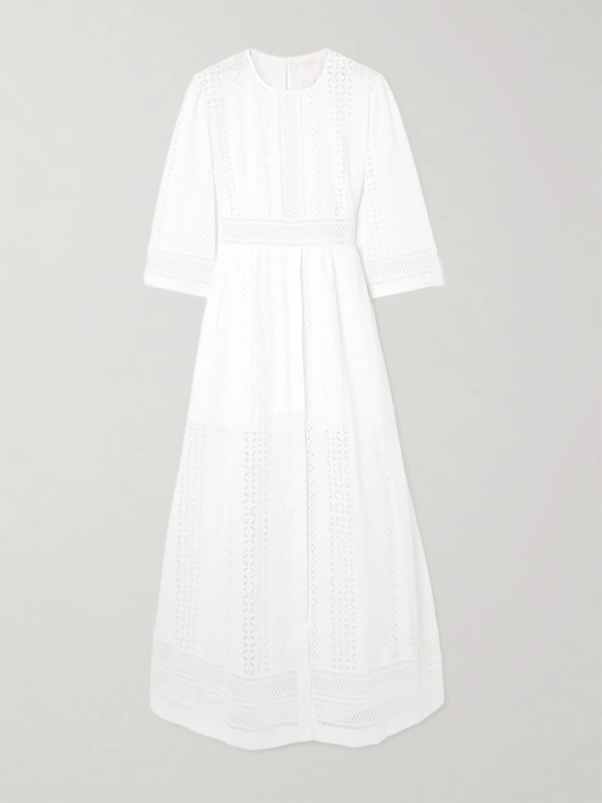 The broderie anglaise decorating Loretta Caponi's midi dress is so evocative of summertime. It's been locally made in Tuscany from Italian cotton and has contrasting paneling at the waist, cuffs and hem. Style yours with equally elegant accessories.