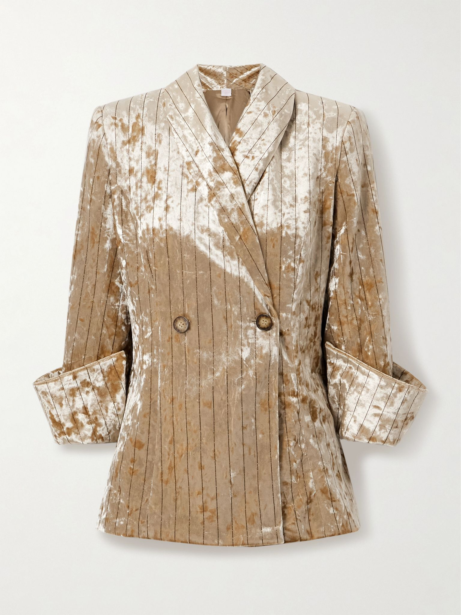 Loretta Caponi's 'Quarzo' blazer is made from tactile crushed-velvet that lends a glamorous, elevated touch to the classic design. It has a slim shape with shawl lapels and exaggerated cuffs that are meant to be turned up. Size & Fit - Fits true to size, take your normal size - Those with broad shoulders may wish to take the next size up - Designed for a slim fit - Internal shoulder pads - Mid-weight, slightly stretchy fabric - Model is 177cm/ 5'10" and is wearing a size Small Model measurements: - Bust: 85cm/ 33.5" - Waist: 62cm/ 24.5" - Hip: 91cm/ 36" Details & Care - Peach and black crushed-velvet - Button fastenings through double-breasted front - 96% polyester, 4% elastane - Fully lined - Dry clean